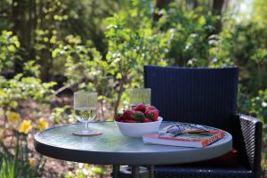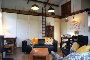 Het huisje is binnen heerlijk hoog, voor een ruimtelijk gevoel. U kunt er comfortabel met vier personen logeren. De gezellige woonkamer met houtkachel heeft een eethoek en een zithoek met uitzicht op de tuin.
